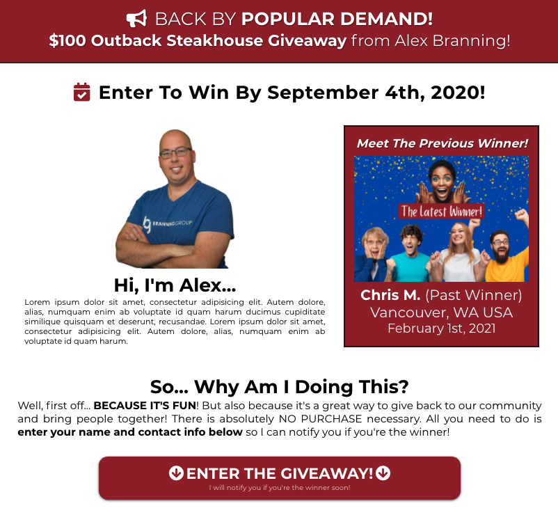 We have a new funnel design (below) for Giveaway Funnel clients running a new campaign after their first Giveaway Funnel. You have the option to use the new funnel design for this campaign, or use the same design as your first Giveaway Funnel.